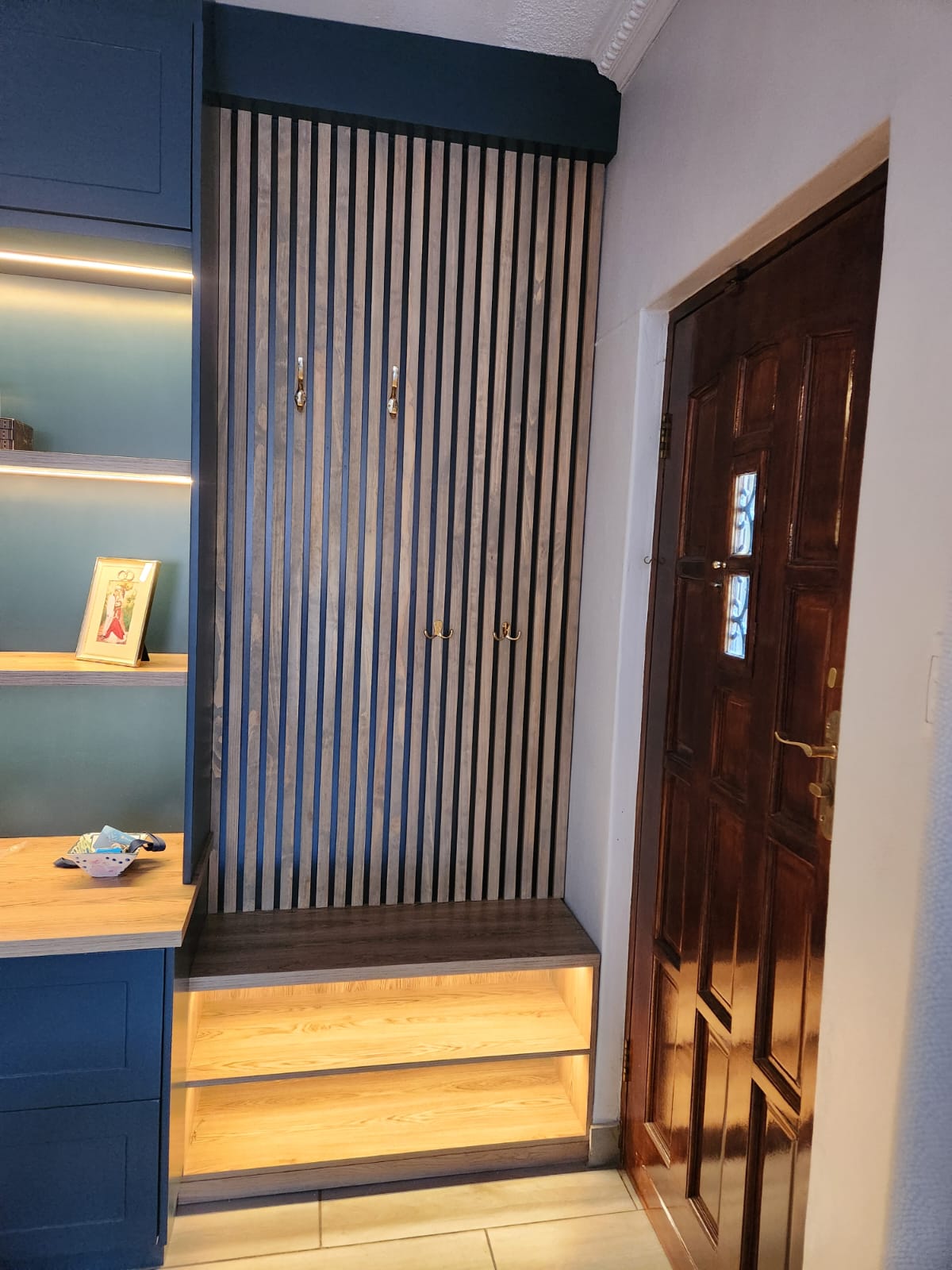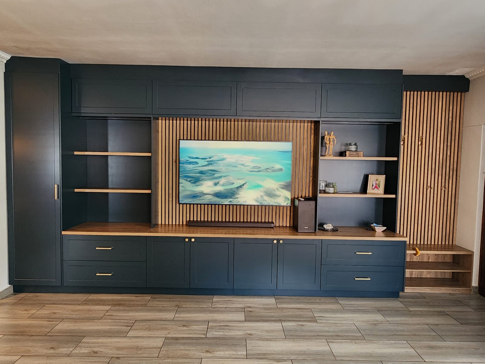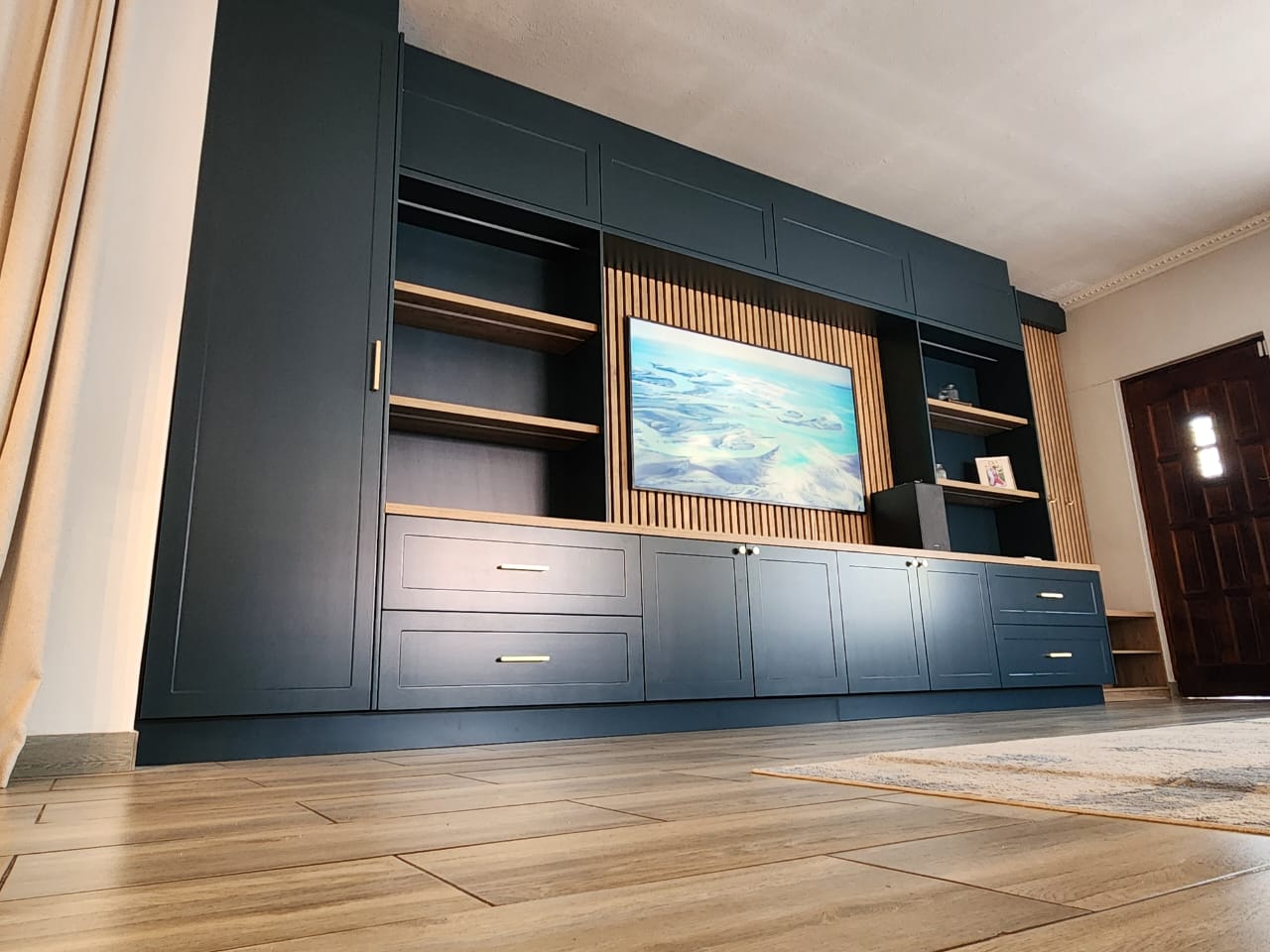 A TV unit that speaks 1000 words with it’s deep blue ducco custom spray painted shaker doors.